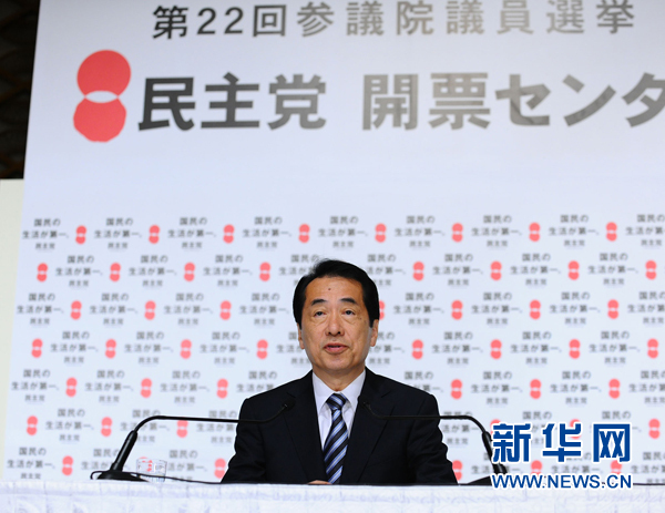7月11日,在日本首都東京民主黨競(jìng)選總部,民主黨代表(黨首)、日本首相菅直人出席記者會(huì)。據(jù)日本廣播協(xié)會(huì)電視臺(tái)報(bào)道,日本執(zhí)政的民主黨在11日舉行的國(guó)會(huì)參議院選舉中失利,自民黨等在野黨占據(jù)了參議院超過(guò)半數(shù)的議席。 新華社記者 季春鵬 攝