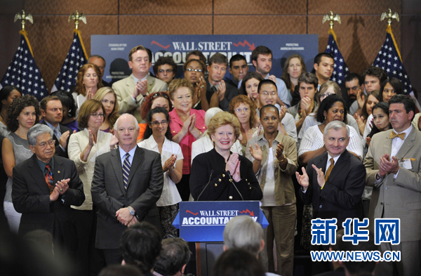 7月15日,在美國首都華盛頓國會山,參議員黛比·施塔貝諾(中)在最終版本金融監管改革法案投票后舉行新聞發布會。美國國會參議院當天通過最終版本金融監管改革法案,為該法案最終成為法律清除了最后障礙。新華社記者張軍攝