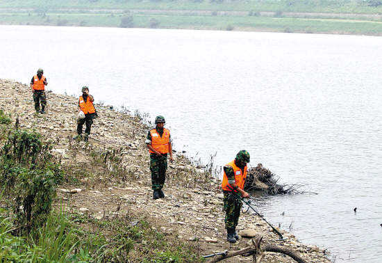 8月2日,韓國士兵在朝韓邊界韓國一方搜尋被洪水沖來的地雷(羊城晚報)