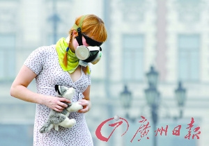 8日,一名莫斯科女孩頭戴密實的口罩抵擋煙霧。