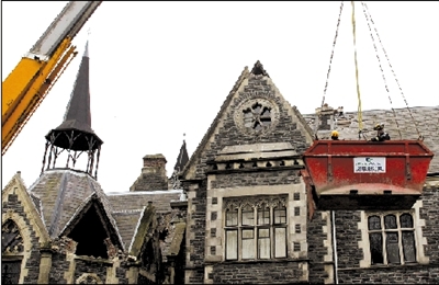 5日,新西蘭搜尋和救援人員利用起重機整修地震中受損的建筑。