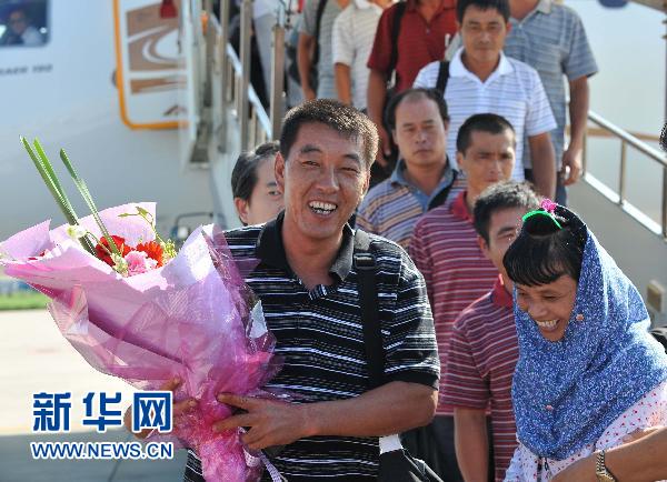 9月13日,來自福建省泉州市的李國金(前左)等走下飛機。當日15時,經過中國政府嚴正交涉,被日方非法抓扣的14名中國漁民乘中國政府包機安全返抵福州。新華社記者 張國俊 攝