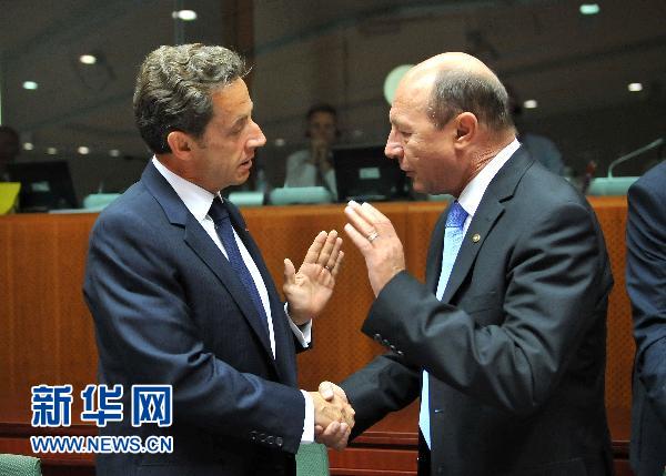 9月16日,在比利時首都布魯塞爾的歐盟總部,法國總統薩科齊與羅馬尼亞總統伯塞斯庫在首腦會議現場交談。當天,歐盟首腦會議在布魯塞爾舉行。 新華社記者武巍攝