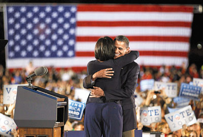 奧巴馬與米歇爾在臺上擁抱,打溫情牌鼓動支持者投票。