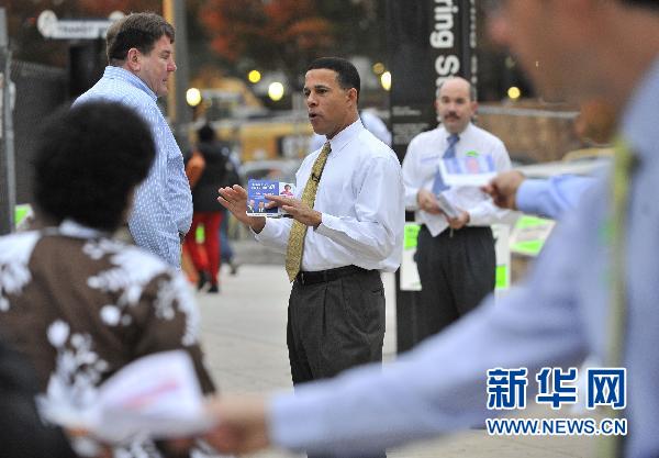 10月26日,在美國首都華盛頓以北10公里的馬里蘭州銀泉,馬里蘭州副州長(zhǎng)安東尼·布朗(中)在街頭散發(fā)競(jìng)選傳單,與選民交談。美國中期選舉將于11月2日舉行,民主黨和共和黨將爭(zhēng)奪國會(huì)眾議院全部435個(gè)議席和參議院100個(gè)議席中的37個(gè)。此外,38個(gè)州長(zhǎng)及兩個(gè)美國海外屬地行政長(zhǎng)官也將同時(shí)改選。新華社記者 張軍 攝