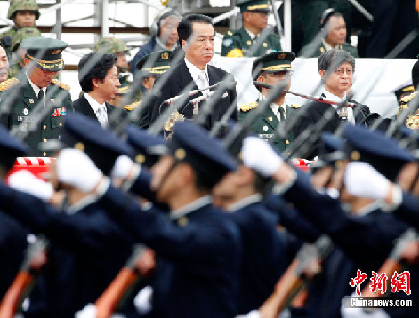 資料圖片:當地時間10月24日,日本自衛隊在東京以北的朝霞基地舉行閱兵儀式。日本首相菅直人檢閱了這次自衛隊的分列式。