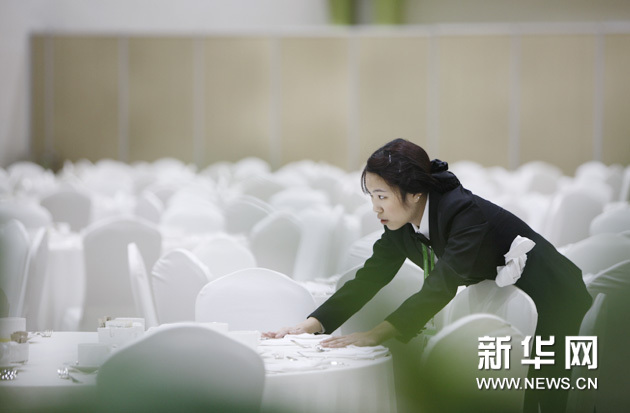 11月9日,服務(wù)員在韓國首爾G20峰會新聞中心內(nèi)整理餐桌。韓國首爾G20峰會即將于11月11日開幕,會場內(nèi)各項準備工作有條不紊進行中。新華社記者段卓力攝