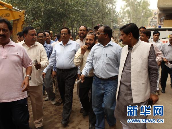 11月16日,一些印度官員在首都新德里的居民樓坍塌現場視察。