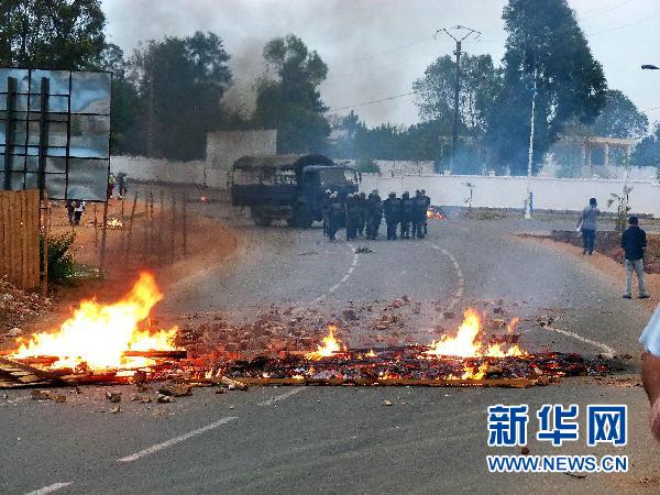 11月17日,在馬達加斯加首都塔那那利佛機場附近,軍人站在燃燒的路障前。馬達加斯加過渡權力機構17日對新修訂憲法草案進行全民公投,當天在馬首都伊瓦多機場附近發生了軍人鬧事事件。事件發生后,馬過渡政府總理維達爾將軍舉行記者招待會,呼吁人民和軍隊保持穩定。他稱少數軍官鬧事的目的是擾亂全民公投,阻撓解決政治危機。新華社/法新