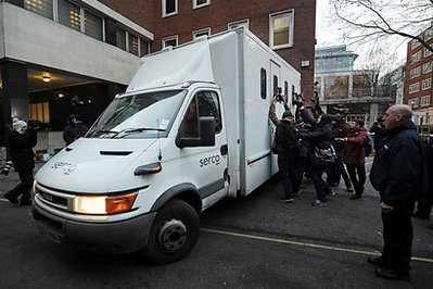 據(jù)信載有阿桑奇的囚車遭到記者的“圍追堵截”。