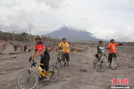 今年10月下旬,位于印尼日惹市的默拉皮火山在沉睡百年后,再次大規模數次噴發,并造成300多人罹難、成千上萬人受傷,數十萬人撤離家園。默拉皮火山11月份停止噴發后,來自印尼各地的民眾紛紛來此旅游觀光;鹕侥_下一個叫GUNGAND被火山巖漿埋沒的村莊,每天來旅游的人數逾5000人。圖為當地的自行車愛好者在默拉皮火山地區騎車游玩。中新社發 顧時宏 攝