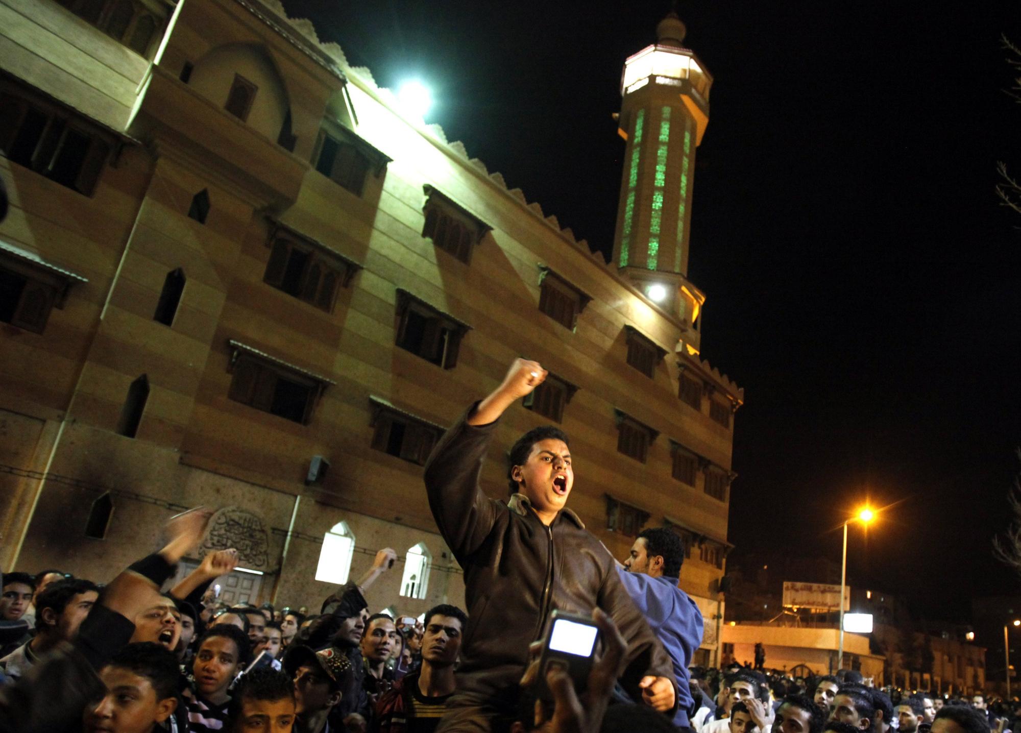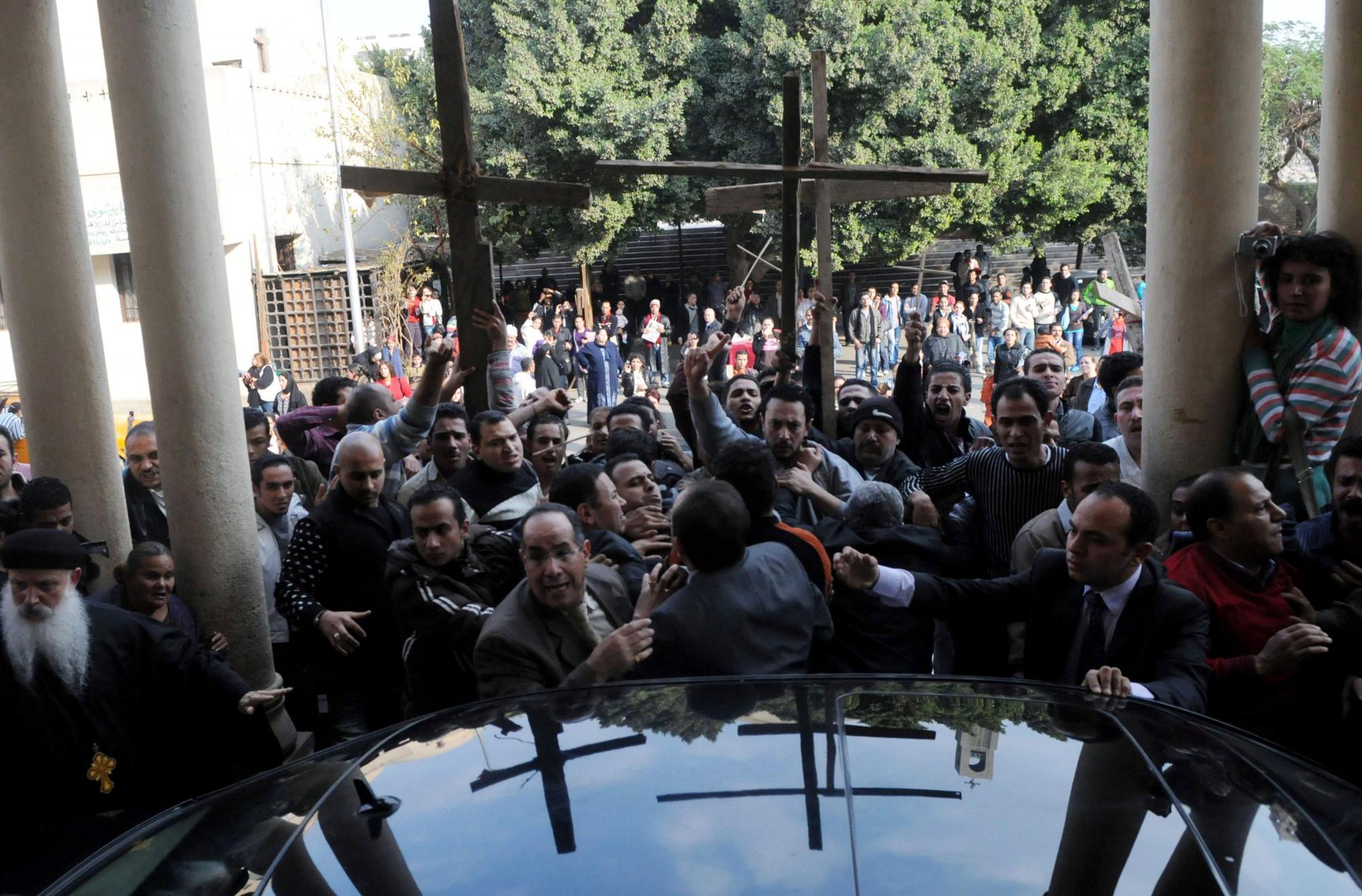1月2日,數(shù)百名青年基督教徒聚集在爆炸事件發(fā)生的亞歷山大市圣徒教堂附近,舉著木制的十字架高呼口號(hào)進(jìn)行抗議