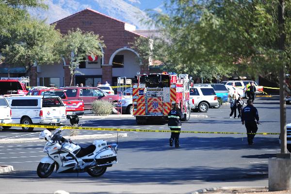 1月8日,救援人員聚集在美國亞利桑那州圖森市的槍擊案現(xiàn)場。新華社/美聯(lián)
