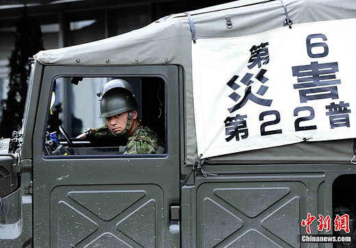 3月14日下午,一名日本自衛隊隊員在仙臺市市政府前的車輛內待命。據報道,日本已經派遣約10萬人規模的自衛隊在地震災區參與救援。中新社發 侯宇 攝