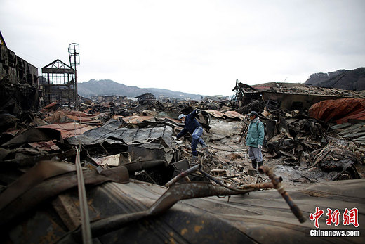 3月15日,日本9.0級(jí)大地震和海嘯過去后。日本巖手縣的一個(gè)小鎮(zhèn)變成了一片瓦礫,人們?cè)谶@片地區(qū)搜索被困人員和能夠使用的物品。