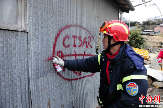 3月15日下午,中國國際救援隊(duì)隊(duì)員在巖手縣大船渡市受大海嘯襲擊后的災(zāi)區(qū)實(shí)施搜救。在確認(rèn)一幢房屋中已經(jīng)沒有生命跡象之后,一名隊(duì)員在墻壁上噴涂標(biāo)識(shí)。大船渡市緊鄰海港,是此次日本東北大地震中受災(zāi)最嚴(yán)重的地區(qū)之一。中新社發(fā) 侯宇 攝