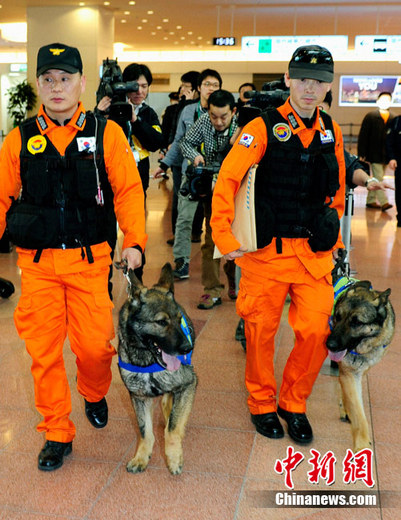 北京時(shí)間3月11日13點(diǎn)46分,日本本州島附近海域發(fā)生里氏9.0級(jí)強(qiáng)烈地震,震中位于宮城縣以東太平洋海域,震源深度10公里,東京有強(qiáng)烈震感。圖為韓國國際救援隊(duì)從首爾機(jī)場啟程飛往日本。