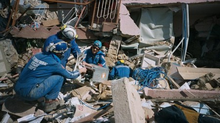 國際救援隊(duì)隊(duì)員在之前的地震災(zāi)區(qū)中實(shí)施救援