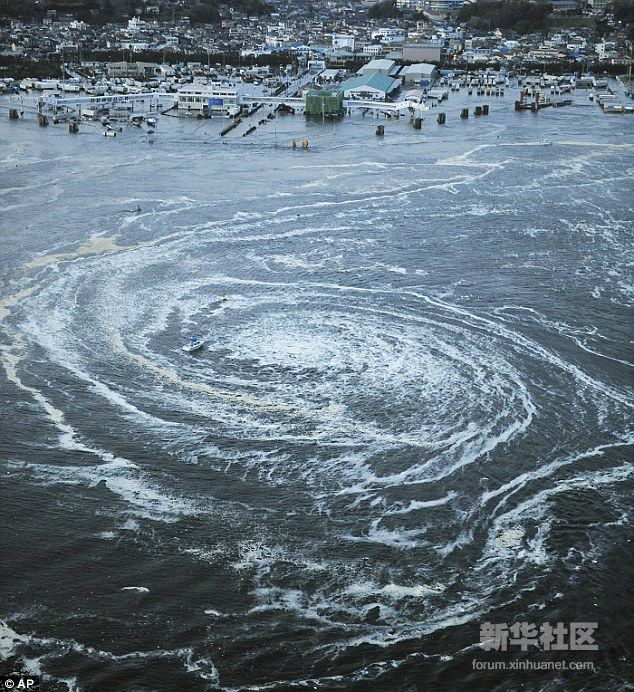 11日,在日本茨城縣,地震引發的海嘯形成漩渦。