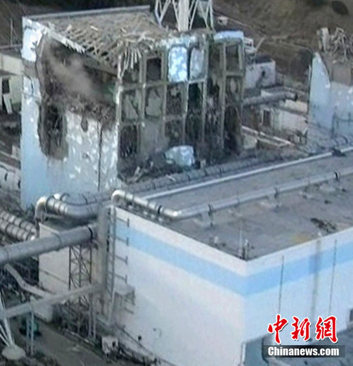 3月16日,由日本自衛隊員在直升機上拍攝的福島第一核電站第四反應堆受損近照。