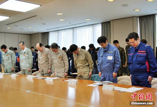 3月18日下午,日本民眾為一周前大地震中6000多名遇難者舉行默哀儀式,所有避難所和救援人員都停止作業,為死難者哀悼。