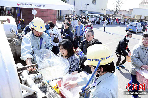 3月13日,福島縣福島市一處紅十字救助站,居民排隊(duì)領(lǐng)淡水。中新社記者 侯宇 攝