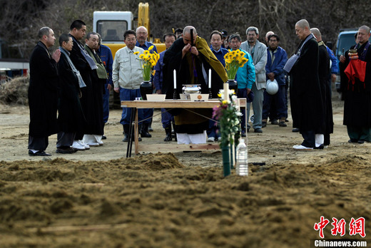 3月22日,宮城縣東松島市集中埋葬多名遇難者,日本僧侶在葬禮現場為遇難者祈禱。