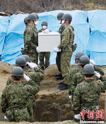 3月22日,日本東北大地震后進入第12天,地震重災區宮城縣東松島市當天早晨集中埋葬多名遇難者。圖為日本地面自衛隊人員向即將入土的遇難者致敬。