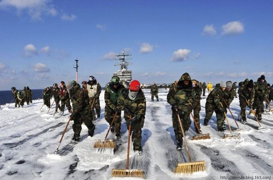 ·美軍士兵給“里根”號航母“洗澡”消除核污染