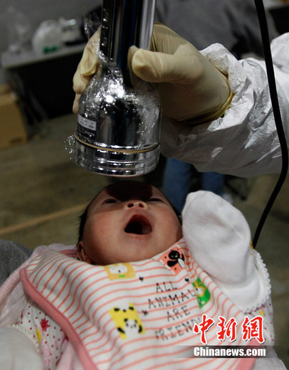 2011年3月31日,日本福島縣一個避難所內,出生于3月15日嬰兒Nagashima Rio正在接受核輻射檢測。她所在的避難所距離福島第一核電站大約70公里。而他所出生的醫院距離福島第一核電站只有約50公里。