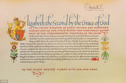 這份由女王親筆簽署、用花體字謄抄的詳盡準許通告,正式宣布同意“我們最為至愛的皇孫威爾士王子、嘉德騎士威廉?亞瑟?菲利普?路易斯,和我們信任的深受喜愛的凱瑟琳?伊麗莎白?米德爾頓結(jié)為連理”。