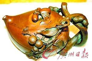 《早生貴子》澄泥石壺高12厘米,長18厘米,寬15厘米。在創(chuàng)作中特別設計了中國傳統(tǒng)婚禮中最常見的紅棗、花生、桂圓三種吉祥物,寓意“早生貴子”。
