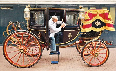 威廉和凱蒂婚禮當(dāng)天極可能下雨,王室職員在擦拭玻璃馬車以備隨時(shí)使用。