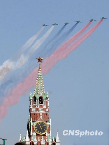 5月9日,俄羅斯在莫斯科紅場舉行規模空前的閱兵活動,紀念衛國戰爭勝利65周年。6架蘇-25強擊機在紅場上空噴出象征俄羅斯國旗白、藍、紅三色的煙霧。