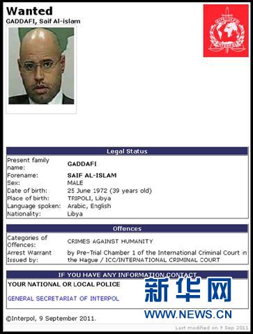 這是國(guó)際刑警組織9月9日發(fā)布的對(duì)卡扎菲之子賽義夫的通緝令。新華社/路透