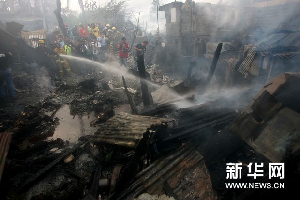 12月10日,消防員在菲律賓首都馬尼拉飛機墜毀的地點滅火。據外電10日報道,一架小型飛機當天在菲律賓首都馬尼拉墜毀,至少7人死亡。 新華社發(烏瑪利攝)