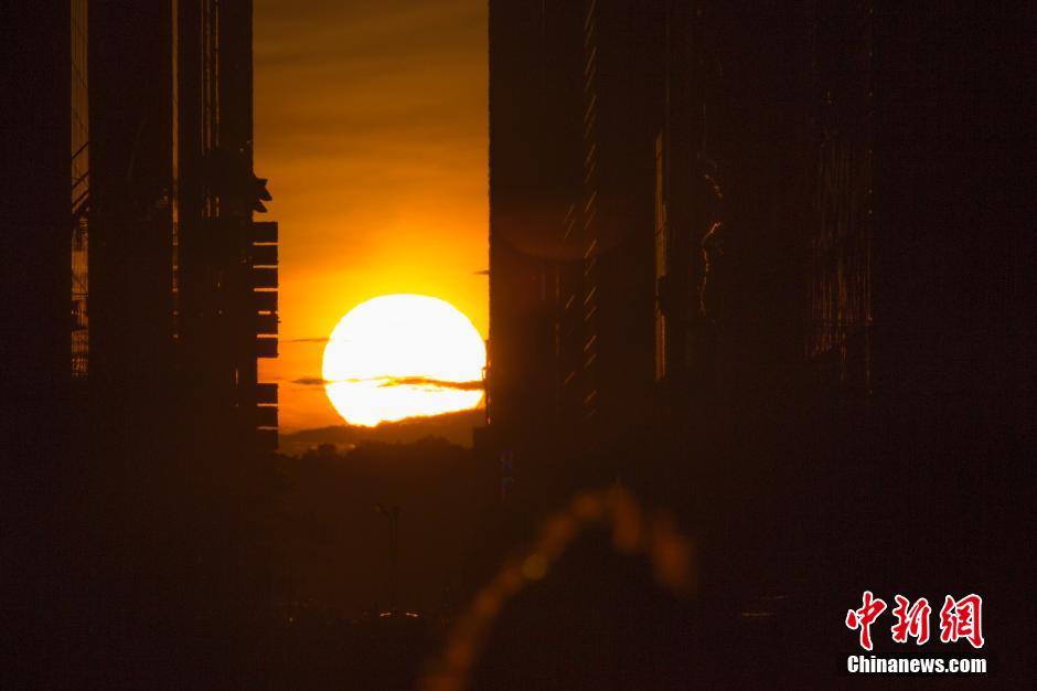 當地時間7月11日傍晚,在美國紐約曼哈頓,大批民眾聚集拍攝“曼哈頓懸日”景觀。曼哈頓懸日是指在美國紐約曼哈頓出現的自然現象,由于曼哈頓街道大多呈棋盤式布局且高樓密集,日落時陽光灑滿曼哈頓的所有東西向街道,該現象每年只出現兩次。 中新社記者 廖攀 攝