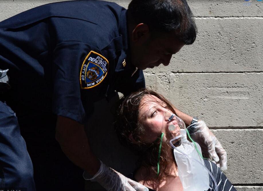 官方消息稱這些目前在醫院中接受治療的人都沒有生命危險。“很多人就這么走著,然后很快倒在了地上,或是趴在車上、倒在人行道上,”目擊者琳賽說。“他們很明顯地站不穩。我看到四輛救護車開過來。”圖為一警察為疑似吸食K2的女子吸氧。