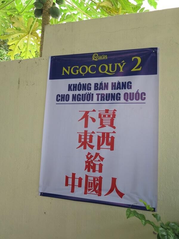 據《聯合早報》援引臺灣“中央社”消息,越南中部峴港市(Da Nang)的玉貴餐廳(Ngoc Quy)在門前張貼以中文和越文書寫“不賣東西給中國人”的告示,公開拒絕服務中國游客。