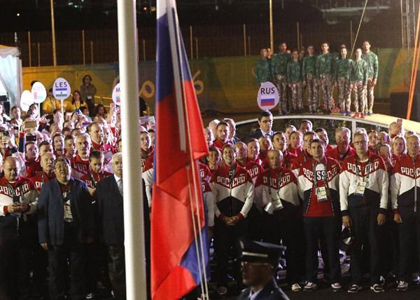8月3日,俄羅斯體育代表團成員在升旗儀式上。 當日,俄羅斯體育代表團在里約奧運村舉行升旗儀式。 新華社記者沈伯韓攝