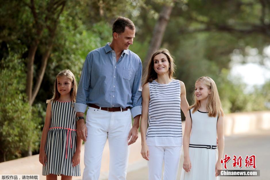 當地時間2016年8月4日,西班牙馬洛卡島帕爾馬,西班牙國王菲利普和王后萊蒂齊亞帶著公主利奧諾和索菲亞在瑪麗溫特宮拍攝全家福。