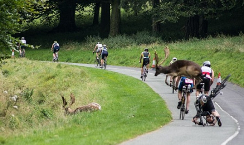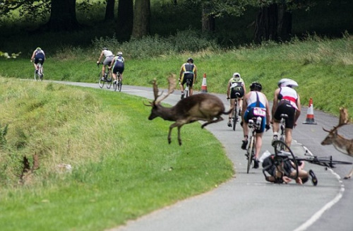報(bào)道稱(chēng),都柏林一個(gè)小鎮(zhèn)日前舉辦鐵人三項(xiàng)比賽,其中自行車(chē)10公里競(jìng)賽在行經(jīng)當(dāng)?shù)匾粋(gè)公園時(shí),草叢中突然竄出兩只鹿,第一只鹿先是靈敏的避開(kāi),跳過(guò)所有騎手,不過(guò)第二只可就沒(méi)這么幸運(yùn)了,它竟然不偏不倚的撞倒了行進(jìn)中的選手尚恩(Shane O'Reilly),讓尚恩當(dāng)場(chǎng)翻摔倒。