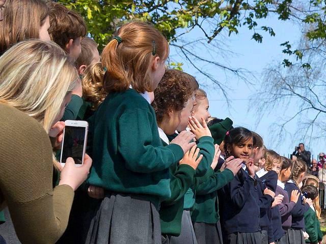 資料:4月20日,溫莎,一隊(duì)學(xué)生在歡迎儀式上向英國女王(未在畫面上)致意。