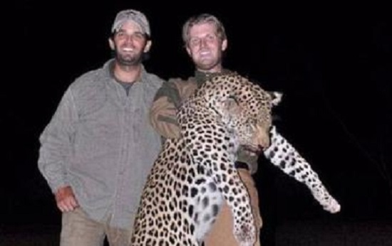 此前,我們經(jīng)常可以通過特朗普的兩個(gè)兒子(小唐納德Donald Jr.和埃里克Eric)在社交媒體上的照片看到他們打獵收獲的“戰(zhàn)利品”:其中有一張就是兩個(gè)人在非洲獵殺的豹子;另一張是小唐納德拿著一條他剛切下來的大象尾巴;還有則是兩個(gè)人微笑著站在美麗的水羚(waterbuck)角中間。
