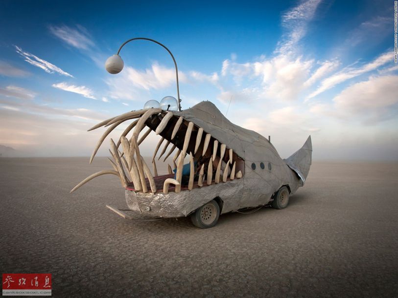 據美國CNN網站9月7日報道,美國內華達州黑石沙漠的80號州際公路上出現了一系列造型奇特的車輛,這些是人們為了慶祝一年一度的“火人節”而打造的藝術品,車輛多是在原型車的基礎上,再添加鋼鐵、木材、紙漿等各種材料改裝而成。圖為改裝車“琵琶魚”號。編譯/余詩泉(參考消息網獨家編譯,轉載請注明出處)