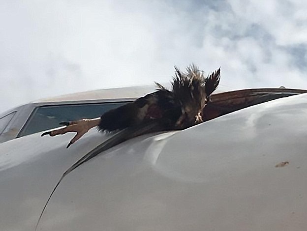 飛機的機鼻受到損壞,出現了很大的凹痕。可以看到機鼻上受到飛鳥撞擊后留下的血跡,甚至還有一只禿鷲尸體嵌在機身上,爪子外翻著,畫面十分血腥。