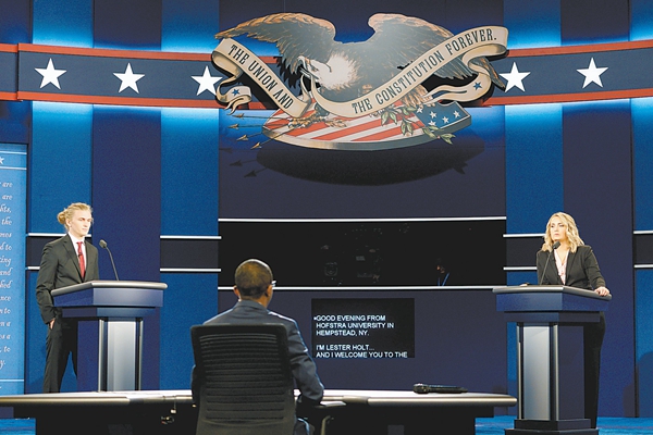 美國總統(tǒng)大選首場辯論當(dāng)?shù)貢r(shí)間26日晚在紐約霍夫斯特拉大學(xué)舉行,圖為當(dāng)?shù)貙W(xué)生在辯論現(xiàn)場預(yù)演。