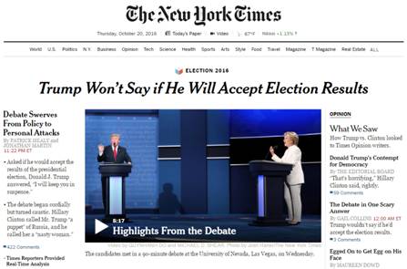 《紐約時報》頭條:特朗普拒絕對是否接受選舉結果表態。