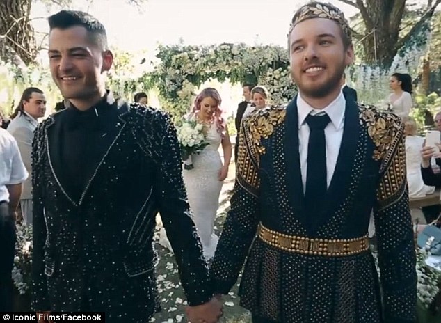 10月15日,澳大利亞男子喬治 艾斯沙(George Elsissa)和米切爾 唐頓(Mitchell Taunton)在該國藍山舉行了奢華的婚禮儀式,結為連理;槎Y上,米切爾頭戴黃金葉狀頭冠,身著點綴黃金葉的同款羅馬風格外套,格外引人注目。