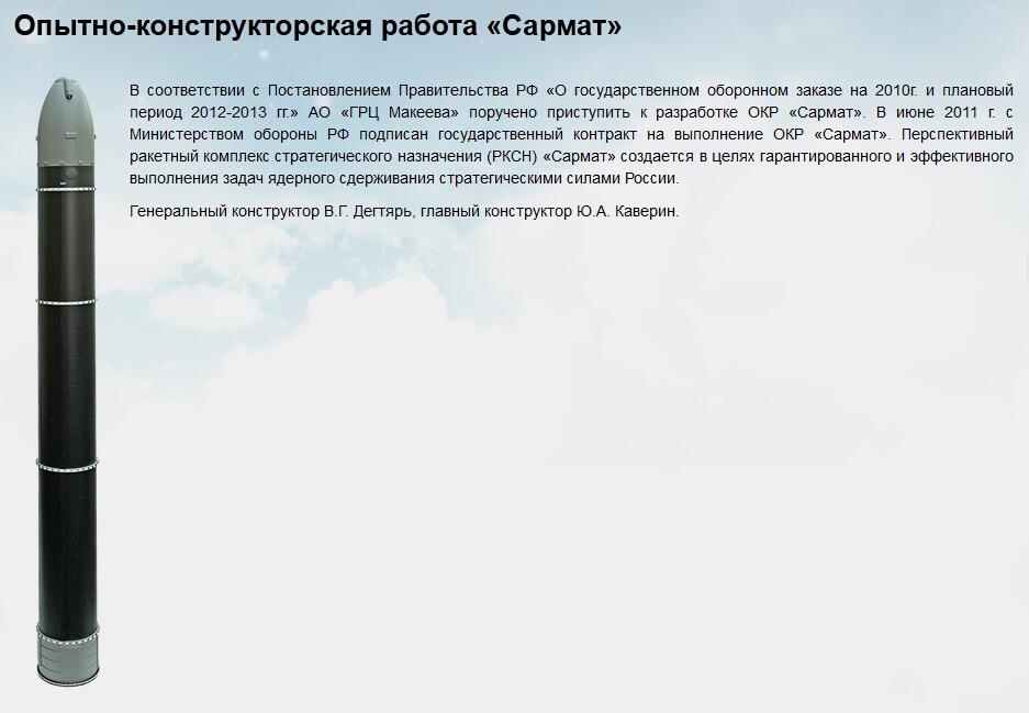 “撒旦”導彈重210噸,可載共2千萬噸黃色炸藥(TNT)當量的最多10個核彈頭,一枚就足以在紐約殺至少400萬人,五、六枚足以抹平美國東岸。“撒旦二型”重量減至逾100噸,載核彈頭當量卻倍增至4千萬噸,是日本廣島長崎原爆的2,000倍,一枚就足以毀滅法國。
